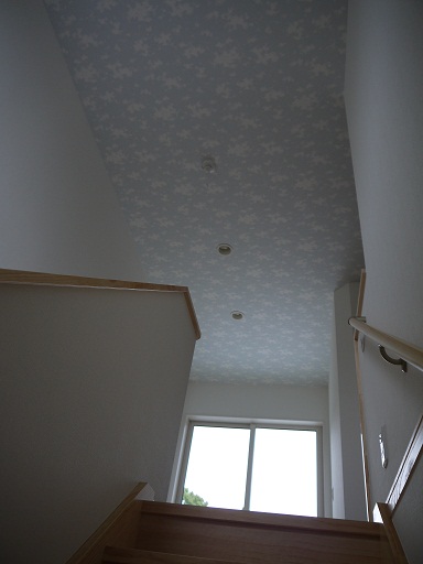 ここからなら満天の夜空を一人占め出来ますね。こちらのテラスへ出るホールの天井のクロスに蓄光タイプをおすすめしました。暗い中で星座が浮かび上がります。このタイプは幼稚っぽかったりチープなイメージがあったのですが、おすすめした品番はクオリティ合格でした。残念ながら新カタログでは廃盤でしたが・・・。