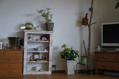 リビングもグリーンがちりばめられて雑貨の使い方とあわせてインテリアも優しさがあふれています。真ん中はめだかの水槽、二つありました。しあわせなめだかたち・・・。