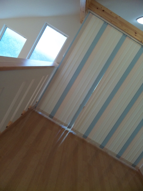 出入りしやすく、プライバシーも保てて、オープンにも容易にできる。羽根の角度調整で微妙なニュアンスで間仕切りを楽しめる。カラーをミックスさせることで単色よりデザイン性もアップする~そんな特性を持つバーチカルブラインドを今回はお勧めしました。
